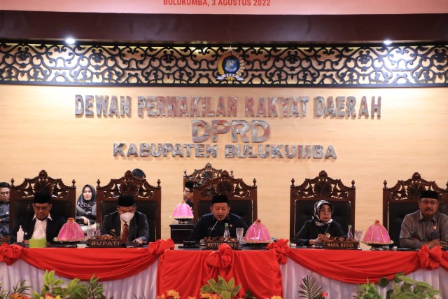 Bulukumba,- Bupati Andi Muchtar Ali Yusuf bersama Wakil Bupati Andi Edy Manaf menghadiri rapat paripurna DPRD Kabupaten Bulukumba dengan dua agenda yaitu persetujuan bersama 3 rancangan peraturan daerah dan penyerahan KUA/PPAS APBD tahun anggaran 2023, Rabu 3 Agustus 2022.