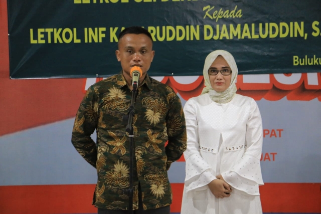 Usai pejabat lama merangkai kata pisah, giliran Letkol Inf Kaharuddin Djamaluddin buka suara. Didampingi sang istri, Nuke Dwi Suhartini, pria asal Pinrang ini menceritakan asal usul daerah, keluarga, hingga riwayat kariernya.