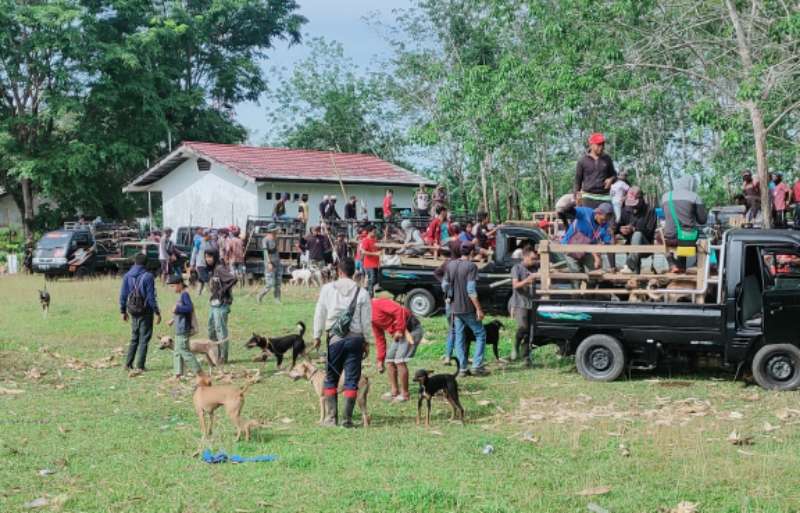 Para pemburu berbondong-bondong datang untuk bersama-sama melakukan perburuan babi di dalam hutan.