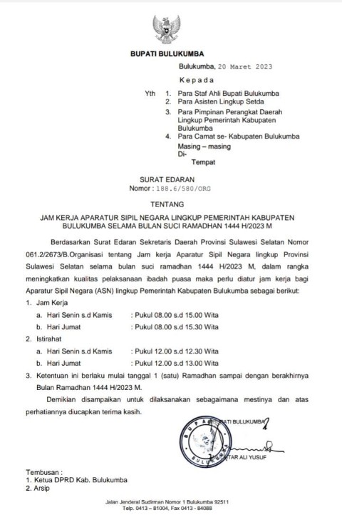Penetapan ini berdasarkan Surat Edaran Bupati Bulukumba Nomor 188.6/580/ORG tentang Jam Kerja Pegawai Negeri Sipil Lingkup Pemerintah Kabupaten Bulukumba Selama Bulan Suci Ramadan 1444 H/2023 M, tanggal 20 Maret 2023.
