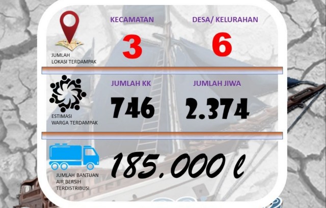 Sementara itu Kepala Pelaksana Badan Penanggulangan Bencana Daerah (BPBD) Akrim A. Amir menjelaskan jika pihaknya telah mendistribusikan setidaknya 185 ribu liter melalui Mobil Tangki ke 746 kepala keluarga yang meliputi 2.374 jiwa tersebar di 3 kecamatan yakni Gantarang, Ujung Bulu dan Ujung Loe, meliputi 6 desa/kelurahan yakni Desa Bontonyeleng, Desa Polewali dan Desa Palambarae Kecamatan Gantarang, sementara untuk Kecamatan Ujung Bulu di Kelurahan Kasimpureng, dan untuk Kecamatan Ujung Loe di Desa Tamatto dan Desa Seppang.(*)