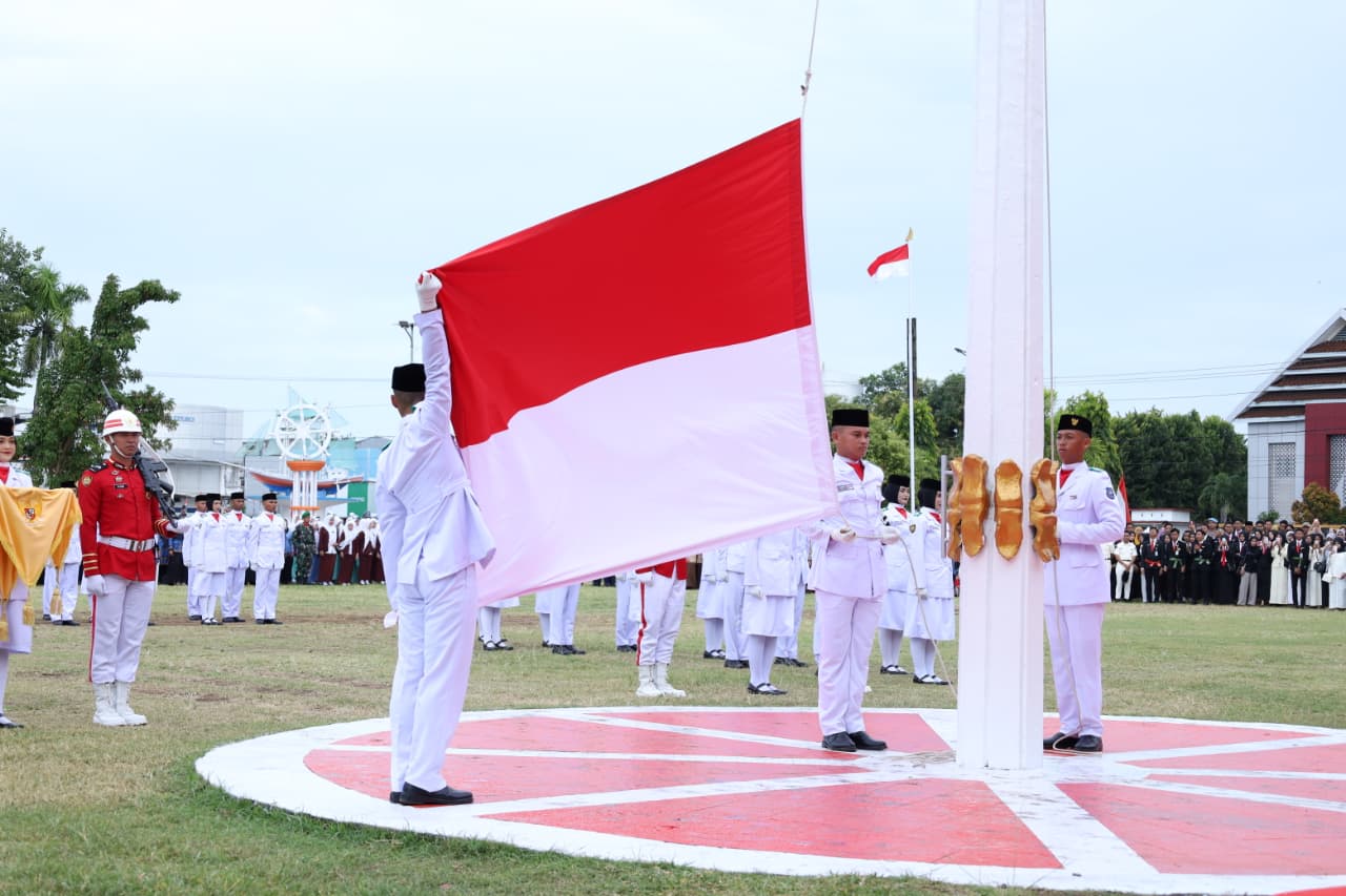 Ratusan peserta upacara, pejabat, dan undangan memenuhi lapangan, menyaksikan detik-detik bersejarah pengibaran duplikat Bendera Pusaka Merah Putih.