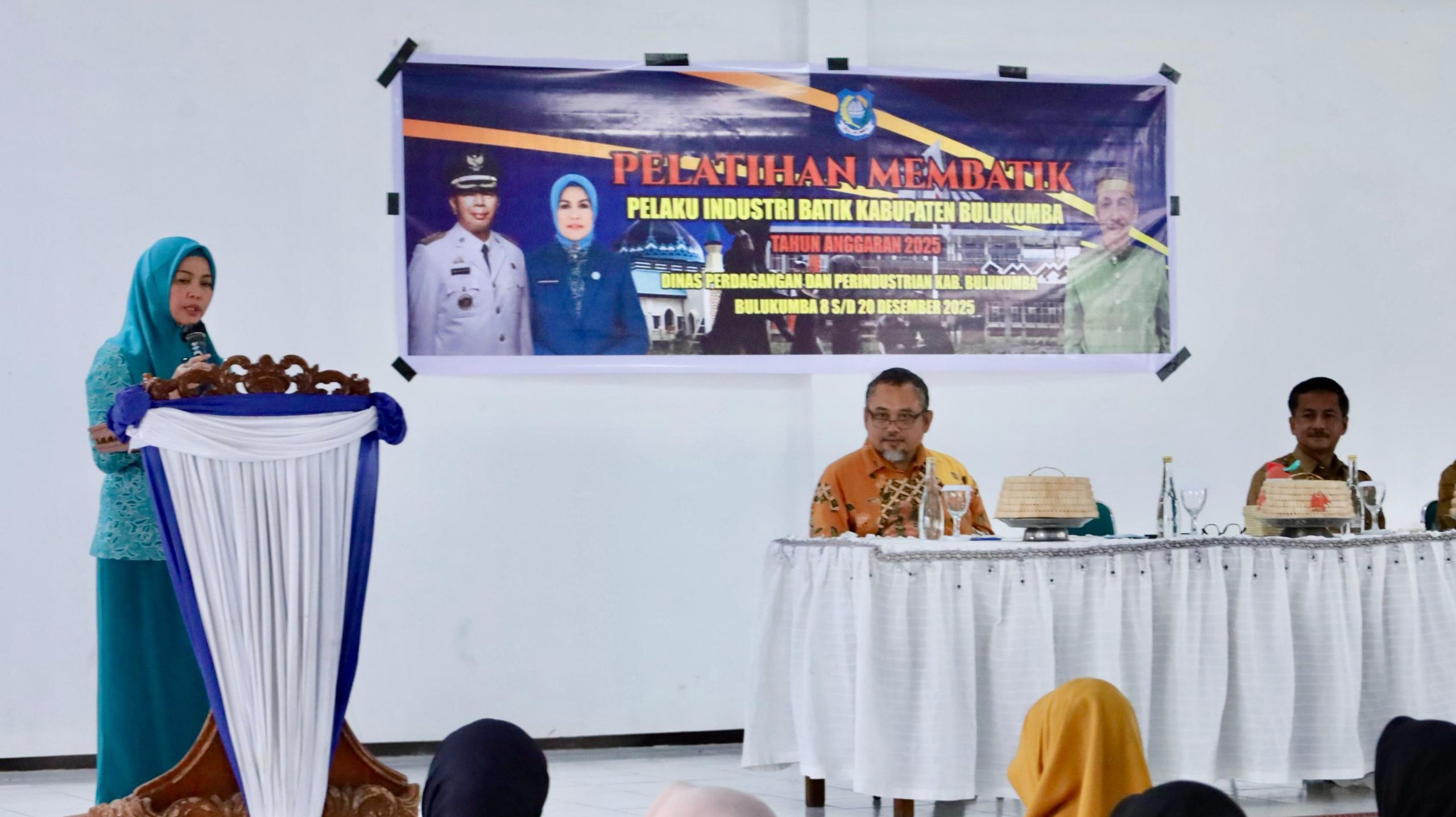 Turut hadir, Asisten Perekonomian dan Pembangunan Muhammad Daud Kahal yang mewakili Bupati Bulukumba, Kepala Disdagperin sekaligus Ketua Harian Dekranasda Alfian, tiga Instruktur ahli dari Balai Besar Standardisasi dan Pelayanan Jasa Industri dan Kerajinan Batik (BBSPJIKB) Yogyakarta, serta para peserta pelatihan.